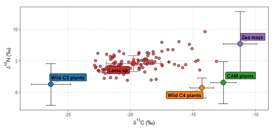 A broad isotopic plant survey is currently underway (Aranibar et al. 2023) to investigate spatial patterns of δ13C and δ15N of different plant types (C3, C4, and CAM) along environmental gradients in the eastern slopes of the southern Andes. This provides a more accurate baseline for reconstructing animal diet, mobility, and trophic relations. Aranibar et al. (2023) reject the previously presented model of increasing δ13C and δ15N at lower elevations and in areas of higher aridity. The spatial frequency distribution of the C3/C4 ratio exhibits a non-linear pattern, with higher C4 abundances at intermediate altitudes, probably driven by atmospheric circulation patterns that generate aridity and C4 dominance at intermediate altitudes. This pattern has a significant impact on interpreting not only the human diet and the human-fauna relationship. The modern plant baseline of isotopic variability continues to lead the exploration of new topics such as investigation of archaeological rodent remains (Ctenomys sp.) as a proxy of paleoclimate and/or maize cultivation in CWA (López et al. 2025).