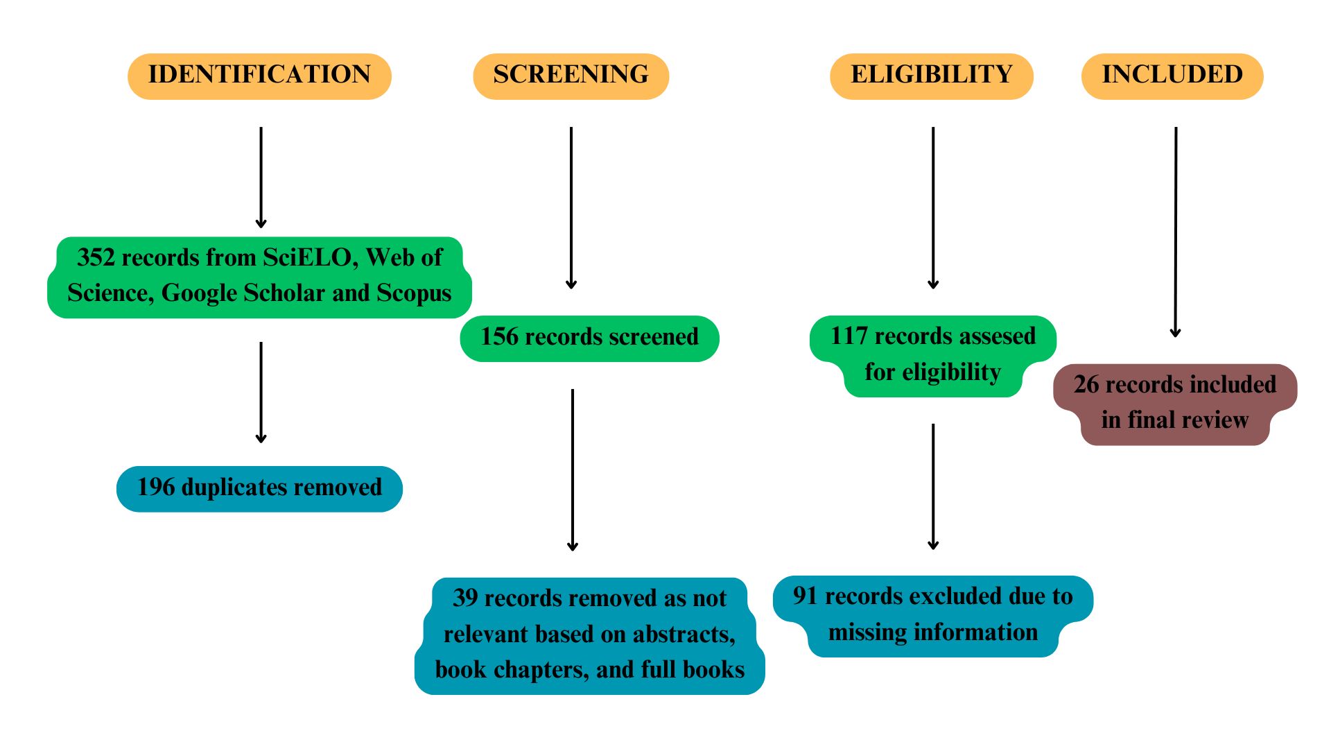 Each database was examined independently. In SciELO, 78 articles were found, of which 35 were included after applying the screening criteria. From Web of Science, 90 articles were retrieved, with 42 selected for final analysis. Google Scholar initially returned 150 articles, of which 60 were deemed relevant after screening. Finally, Scopus identified 34 articles, with 19 included after final screening (Figure 1). In total, 26 articles were included in the review after removing duplicates and applying inclusion/exclusion criteria. The variables analyzed in the selected studies include author(s), year, title, journal, and biome (Table 1).